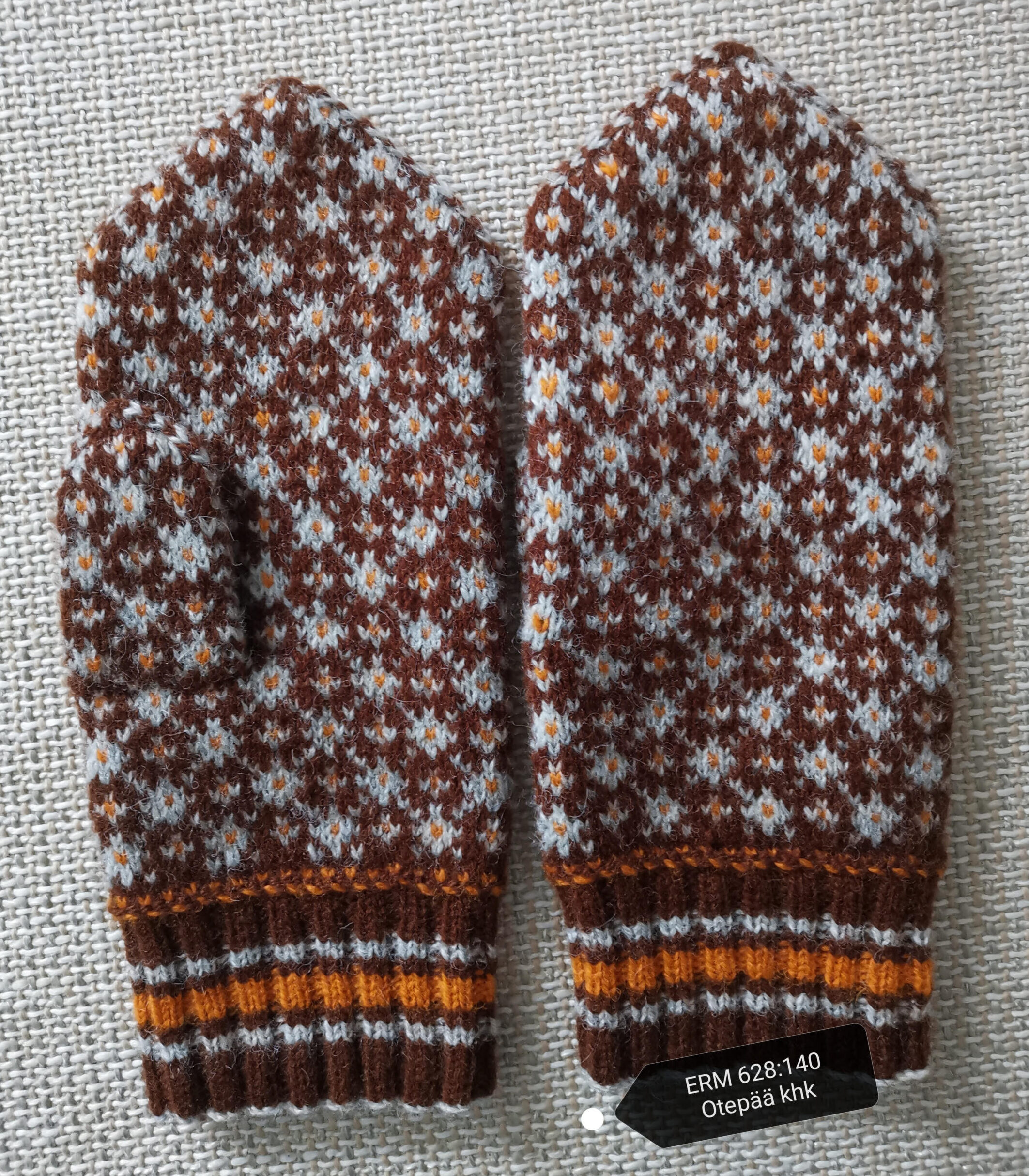 Tiiu Rosenbergi käsitsi kootud naiste kirikindad. Materjal: 100% lambavill. Värvid: pruun, helehall, oranž