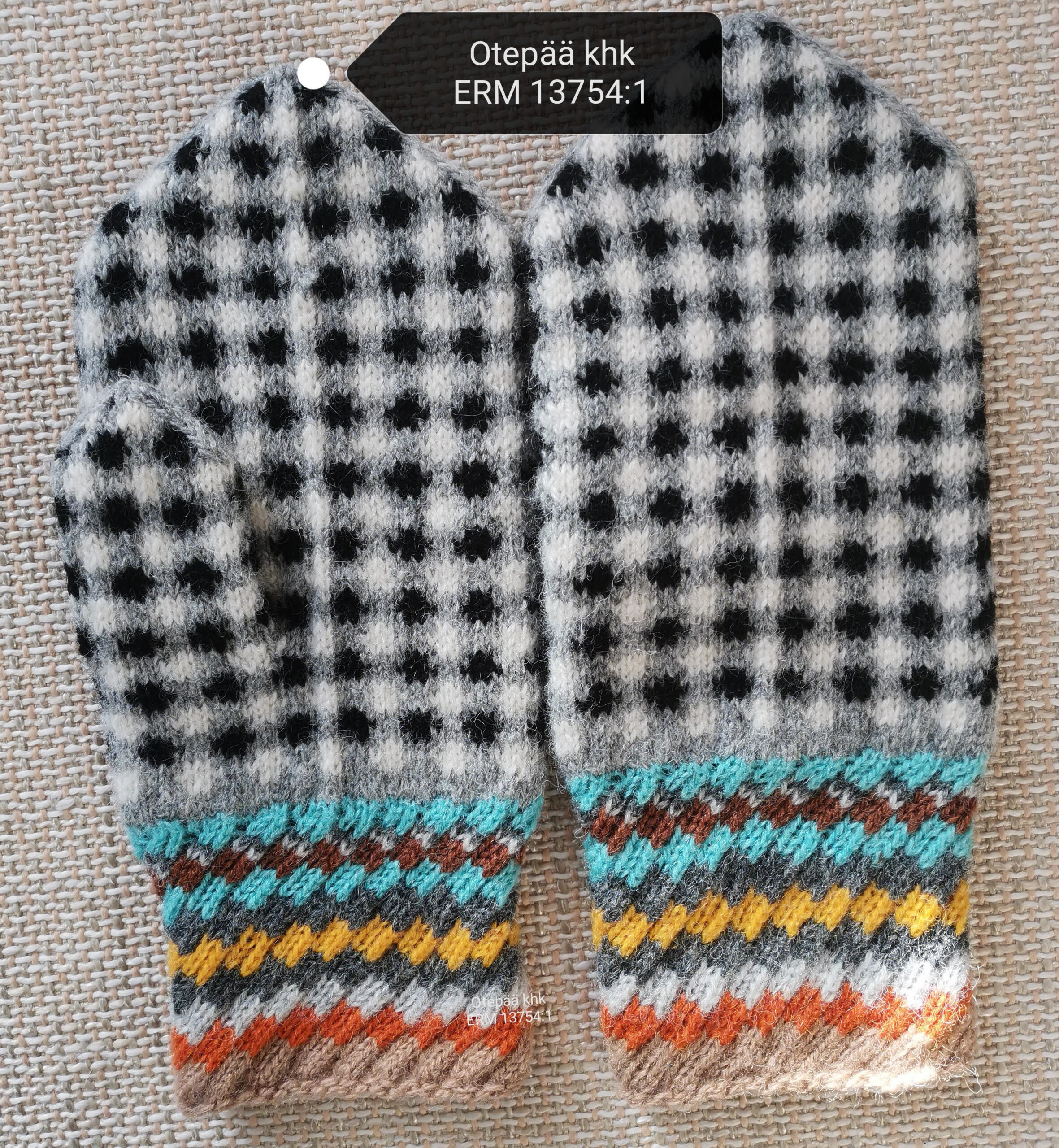Tiiu Rosenbergi käsitsi kootud naiste(meeste) kirikindad. Materjal: 100% lambavill. Värvid: must, helehall, valge, beež, türkiis, oranž, pruun, tumehall